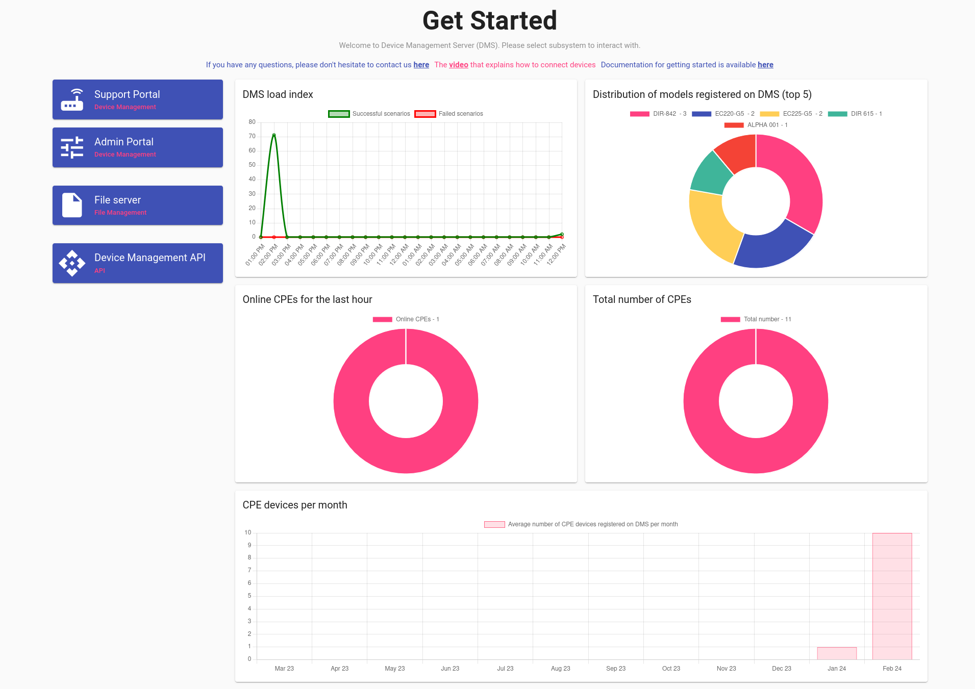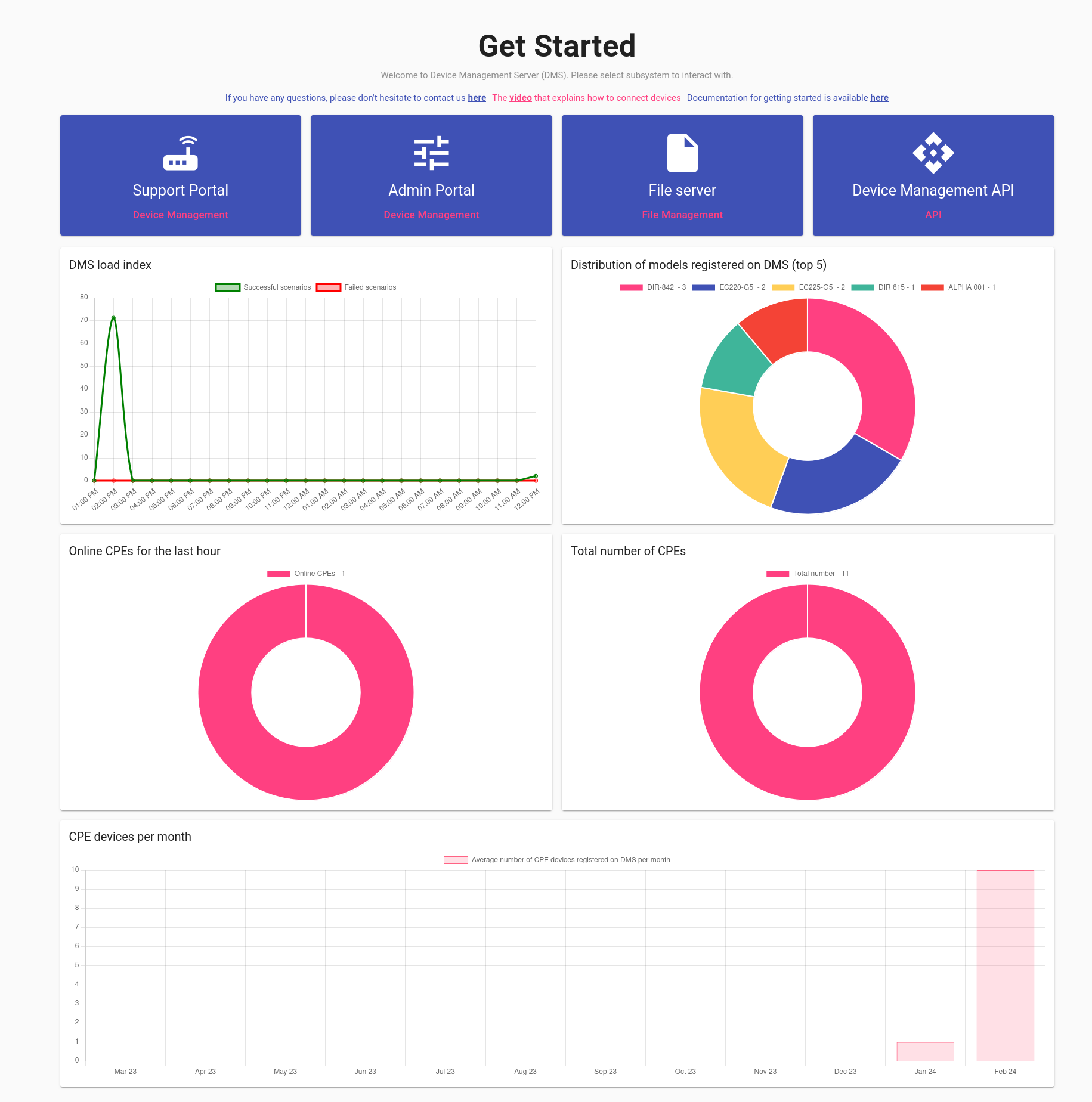 Depending on access rights granted to you, you can either see all access levels or only those to which you have been authorized. Besides access levels, Dashboard displays DMS metrics such as "Load index" - indicating the number of successfully executed or failed scenarios for a certain period of time, "Distribution of CPE models registered on DMS" and "CPE devices registered with DMS per month".