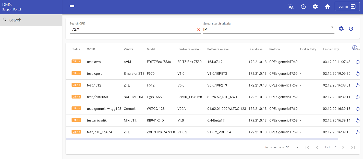 In the table with results, you will see all devices linked to this "IP address". You will get the information about "Status of device" (Online/Offline), "Model", "Software" and "Hardware" version etc. If you don’t know all the information about the device you intend to find and possess only partial or incomplete information, you can use the wild card search in the "Search CPE'' field. The wildcard is an advanced search technique that can be used to maximize your search results by providing all the information that includes this partial data. The two most commonly used wildcards that you can use in Device Management Server are: