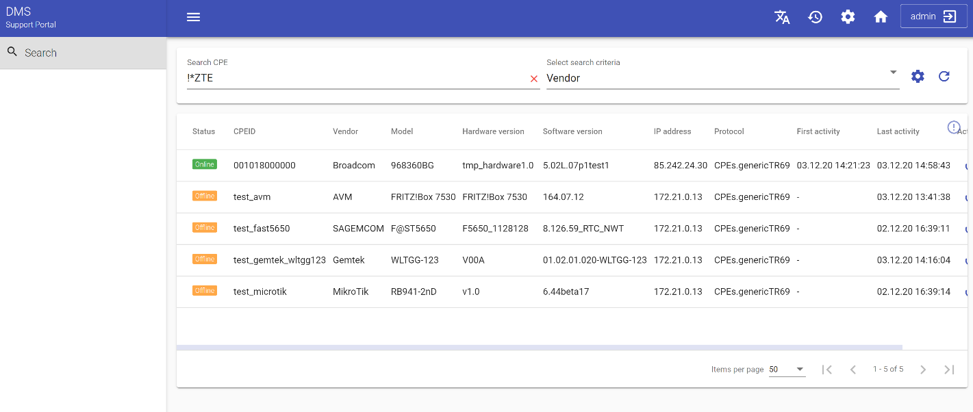 - An exclamation mark (!) at the beginning of the search field means that from the list of results will be excluded all devices which have an exact match with the text in the search field. If you add asterisk after exclamation mark, from the list of results will be excluded all devices that have any match with the text in the search field. Select all table configuration parameters ("Status", "CPEID", "Vendor", "Model", "Hardware", "Software", "IP Address", "First Message", "Last Message", "Actions" etc.) or specify only necessary.